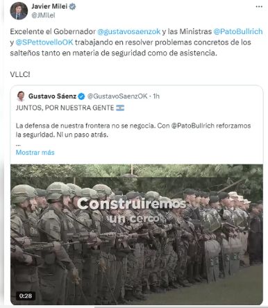"Excelente el gobernador Gustavo Sáenz y las ministras Patricia Bullrich y Sandra Pettovello trabajando en resolver problemas concretos de los salteños tanto en materia de seguridad como de asistencia", expresó el mandatario en sus redes sociales, al ponderar las gestiones de las carteras de Seguridad y Desarrollo Social, respectivamente.